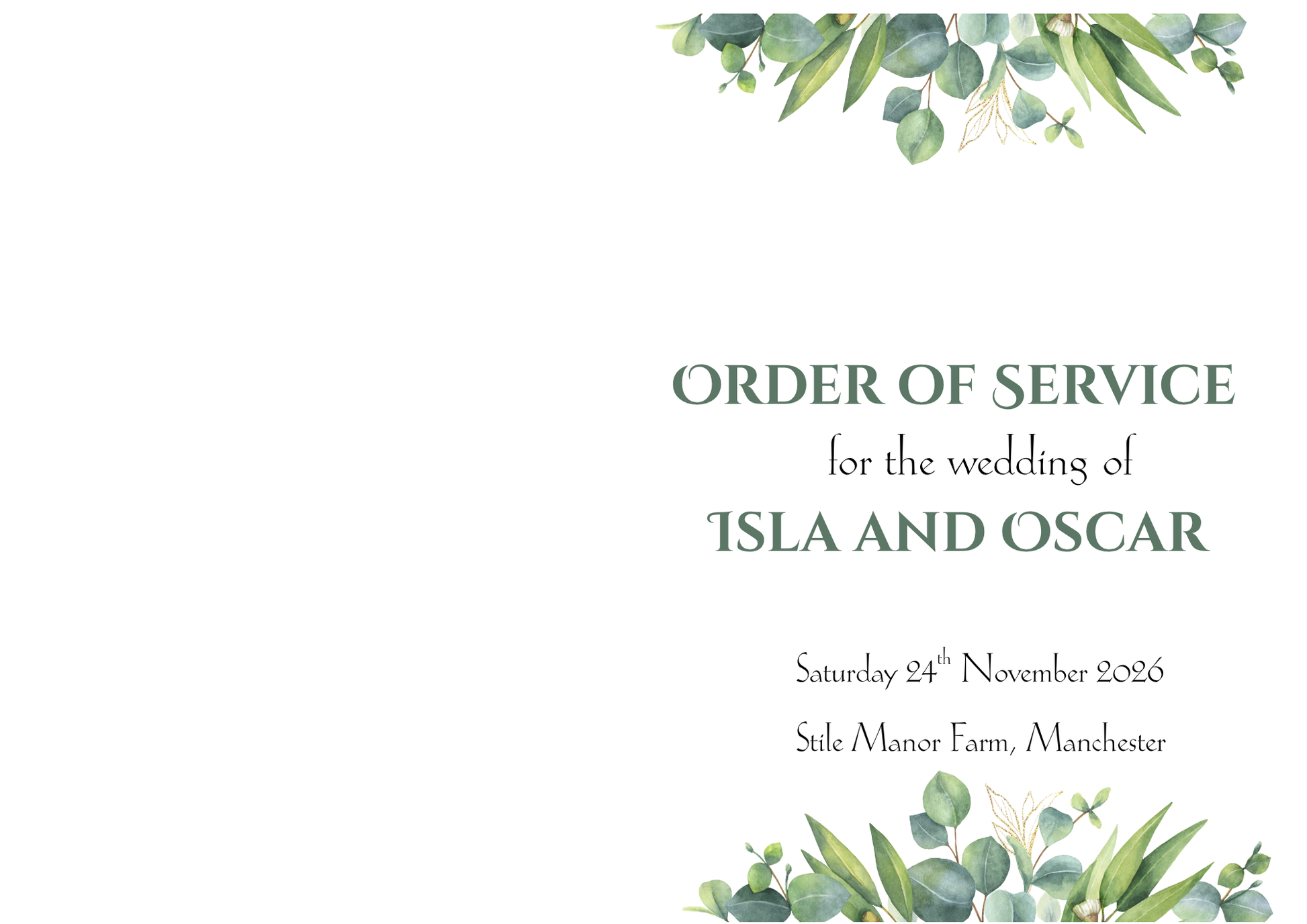 Guide your guests through your special day with our elegant Order of Service Booklet from the Eucalyptus Watercolour Collection. Featuring hand-painted greenery and a timeless design, this booklet is the perfect keepsake for your wedding ceremony.