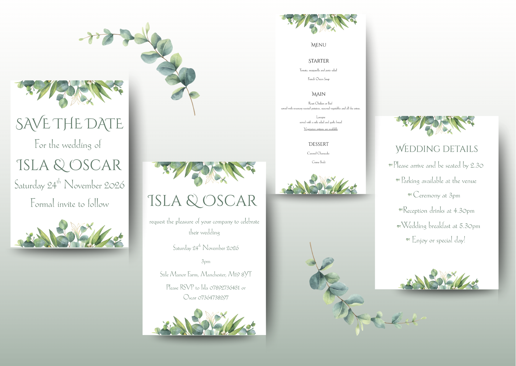 Eucalyptus Watercolour Wedding Stationery Bundle 1 | Invitations, Save the Dates & Menus