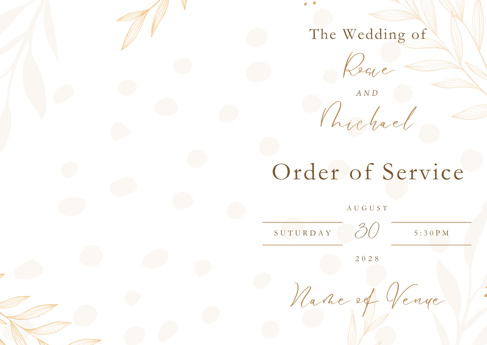 - Personalised with couple’s names, date, venue, and service details